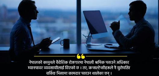 उनीहरूले ल्याउन नसकेपछि कन्सल्टेन्सीवालाहरू सक्रिय देखिए । युरोपतिर संस्थागत रूपमा नै कामदार पठाउन सकियो भने त राम्रै हो नि । त्यसमा म्यानपावर व्यवसायी लाग्नुपर्यो ।’ वैदेशिक रोजगार विभागका महानिर्देशक उमाकान्त आचार्यले भने ।